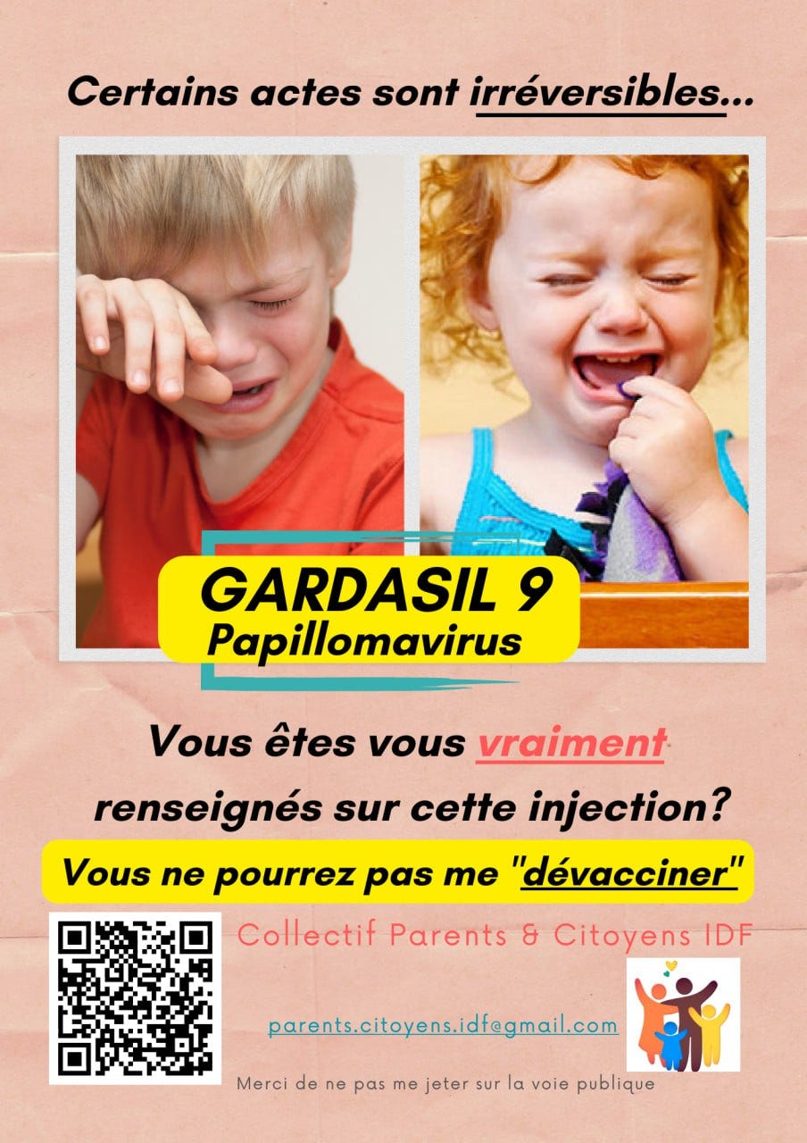Depuis l’annonce du président à Jarnac, les entreprises pharmaceutiques, les médias, l’institut national de lutte contre le cancer et le nouveau ministre de la Santé font la promotion de la vaccination anti-HPV contre les prétendus « cancers du HPV et tous assènent quotidiennement des contre-vérités visant à inquiéter les enfants et à culpabiliser les parents.